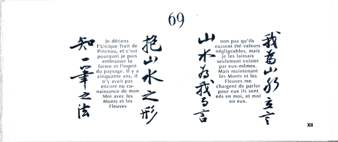Au milieu de l'océan de l'encre, il faut établir fermement l'esprit ; à la pointe du pinceau, que s'affirme et surgisse la vie ; à partir de l'Un, l'innombrable se divise ; à partir de l'innombrable l'Un se conquiert. La métamorphose de l'Un produit Yin et Yang et voilà que toutes les virtualités du monde se trouvent accomplies.J'accouche de ma création, ce n'est pas elle qui pourrait accoucher d'elle-même.